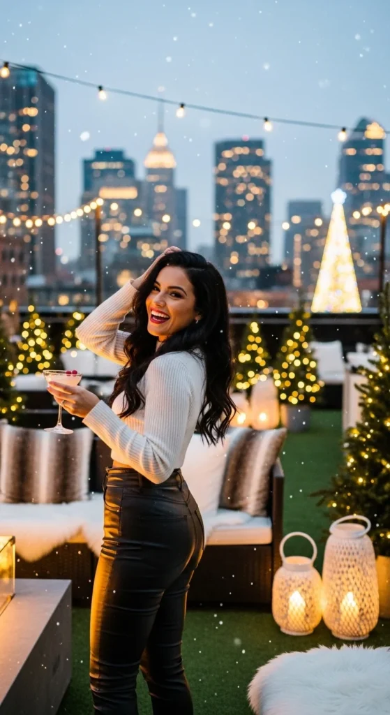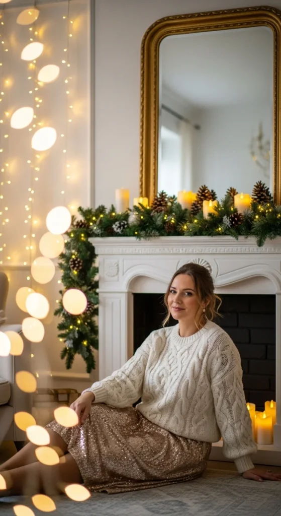 A statement sweater and faux leather skirt combo feels fun and casual. Add sneakers or ankle boots depending on the vibe. For budget styling, upcycle an old sweater with sequins or embroidery to give it a festive update.