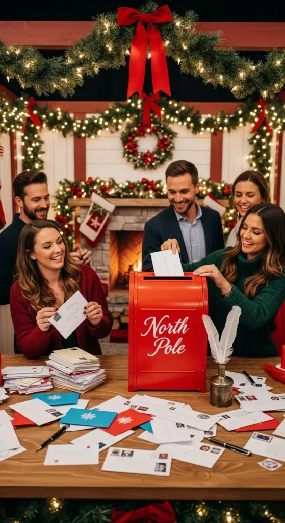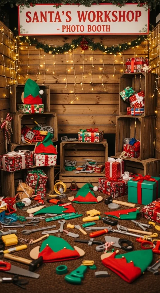 A DIY idea: paint cardboard boxes to look like workbenches. Have someone dress as Santa while others play elves. It’s playful, interactive, and perfect for group photos.