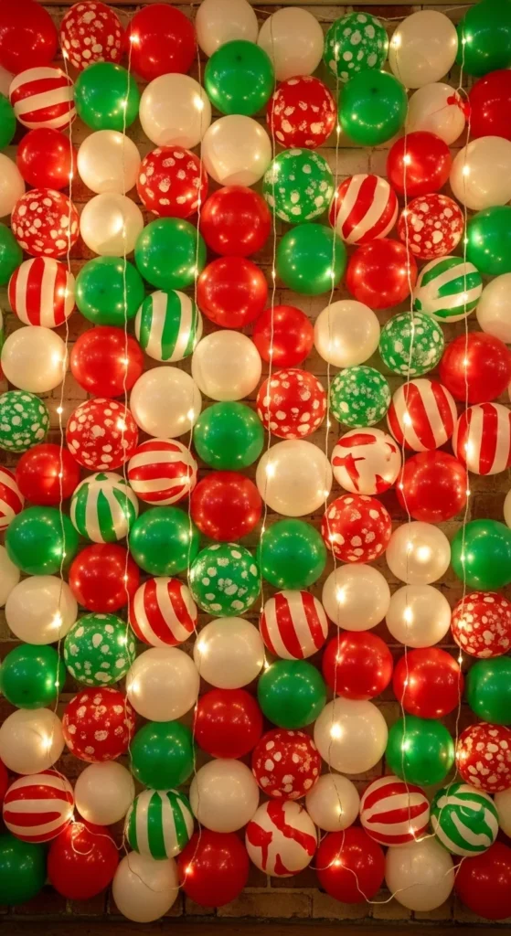 Create a cheerful balloon wall using clusters of balloons in Christmas colors. Add gold or silver ones for shimmer.