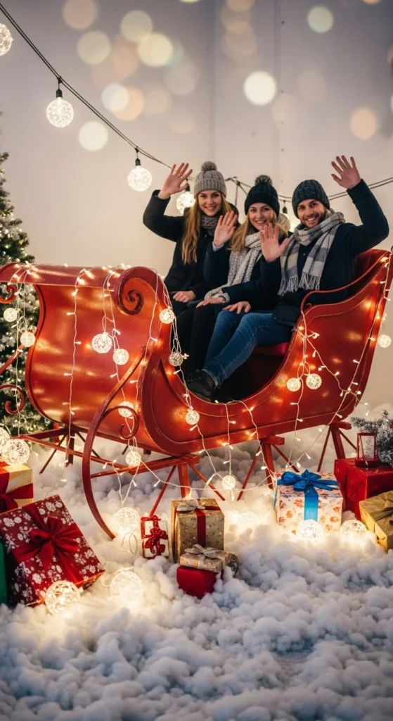 Add reindeer cutouts or LED lights for charm. It’s cozy and great for couples or group shots.