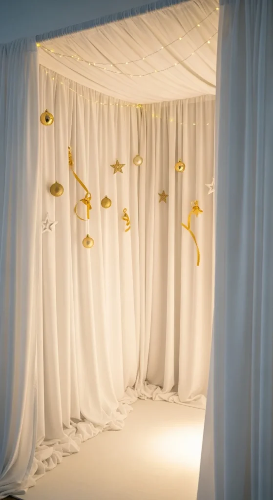 Tinsel curtains are easy to hang and create instant sparkle. Add fairy lights or paper stars for extra flair.