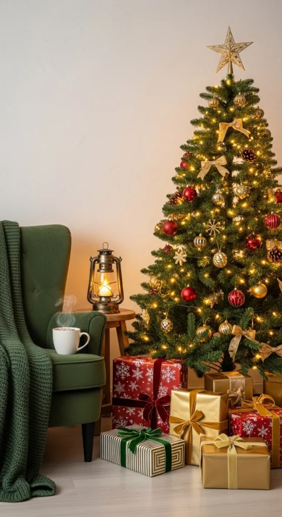 Use your main Christmas tree as a natural booth! Add an armchair or stool beside it and some wrapped boxes for layering.