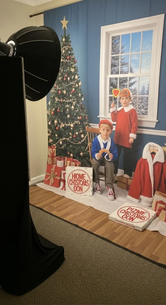 Keep props simple — Santa hats, reindeer antlers, and candy canes. You can even wrap a few empty boxes in shiny paper to fill empty corners. If you’re on a budget, grab paper garlands and dollar-store lights — they work like magic. This booth’s simplicity makes every outfit pop and fits any holiday theme.