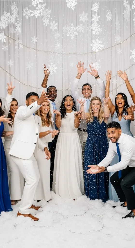 Encourage guests to wear cozy scarves or earmuffs to match the vibe. If you’re outdoors, hang paper snowflakes from a string across the booth. It’s a soft, elegant setup that looks stunning in photos — perfect for winter lovers.