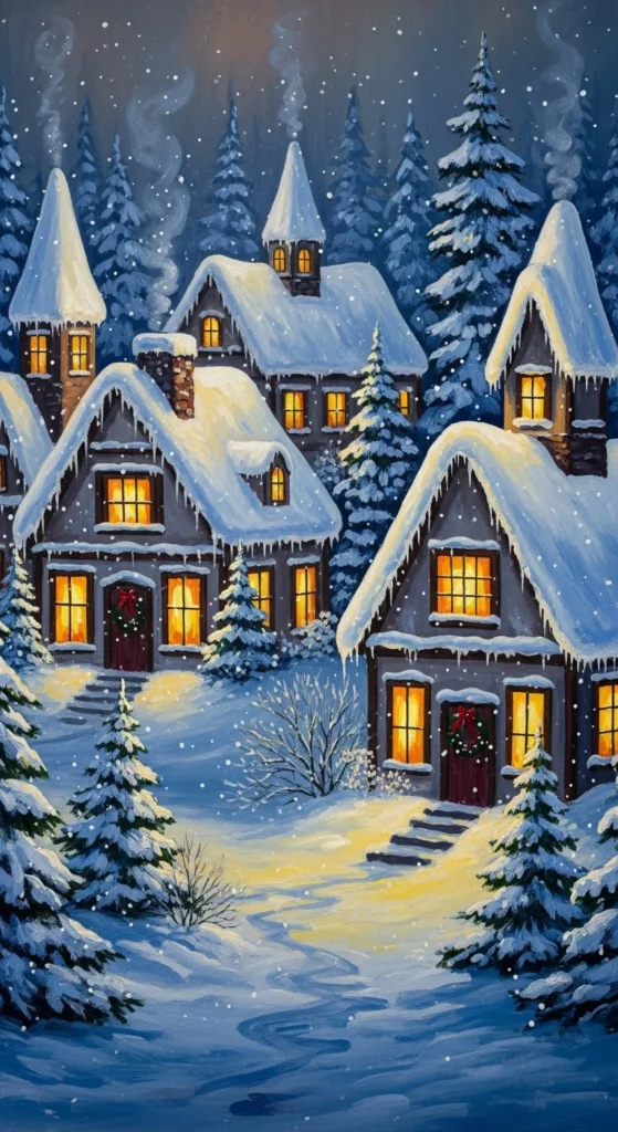 Paint or print a cozy town scene and hang fairy lights to mimic twinkling windows.