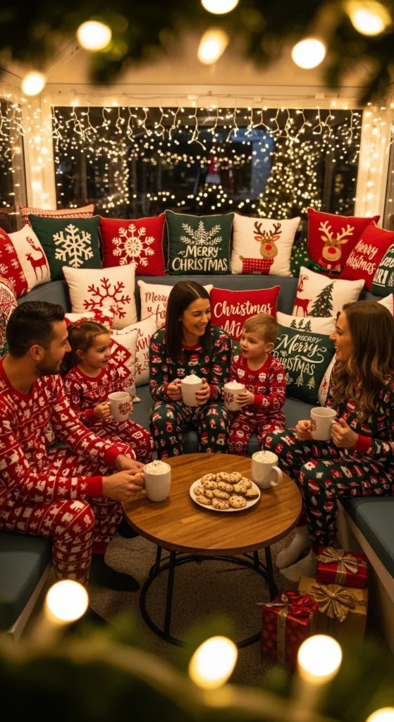 Set up a sofa with warm blankets and matching PJs for everyone. Use soft lights and Christmas cushions.