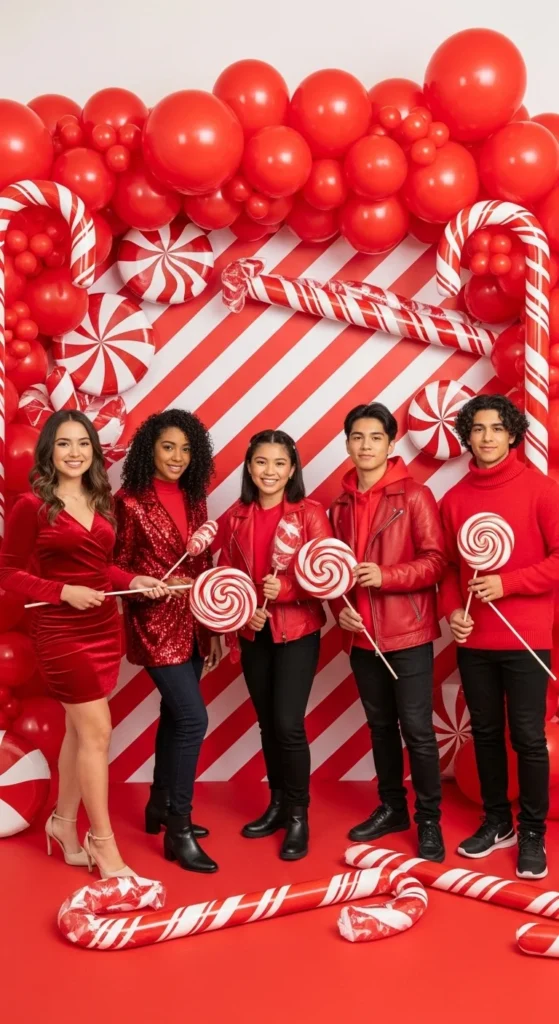 Add red balloons or cut-out peppermints for a cheerful look. To save money, print peppermint swirls and tape them to the wall. The vibrant contrast pops beautifully in photos — a sure favorite for kids and adults alike.