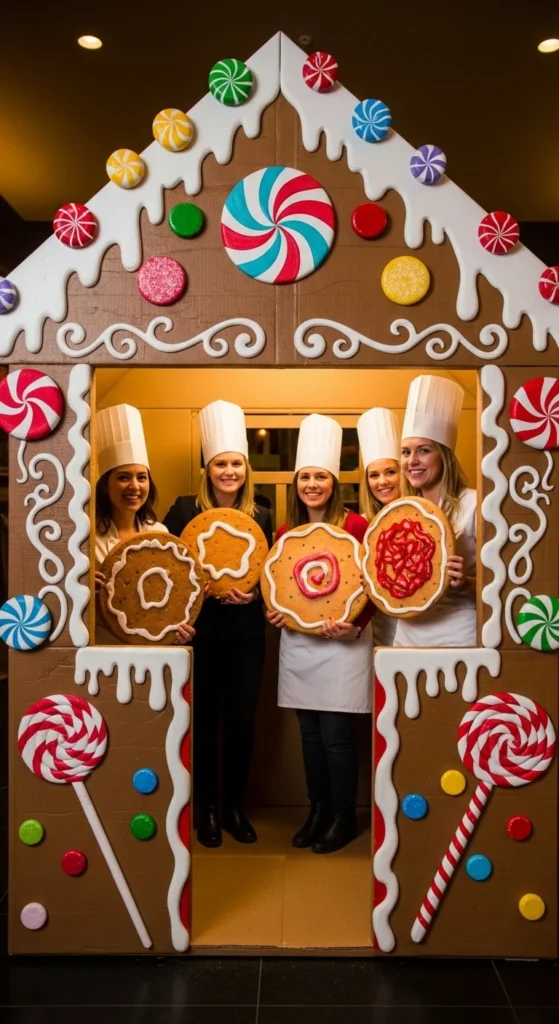 Craft a cardboard “gingerbread wall” and decorate it with candy-colored circles, frosting swirls, and paper gumdrops.