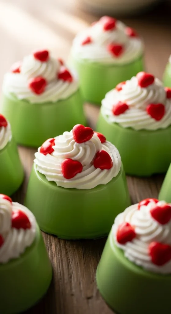 Fill cups with green pudding, top with whipped cream, and add one red candy heart. A playful Grinch dessert everyone recognizes.