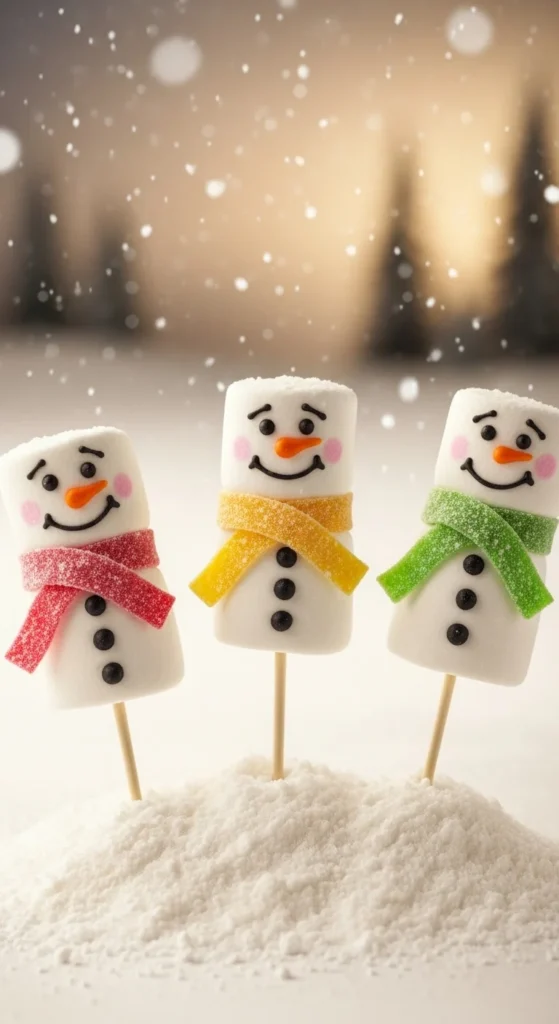 Stack marshmallows on skewers, draw faces with icing, and wrap candy belts as scarves. These snowman pops make perfect edible crafts for kids.