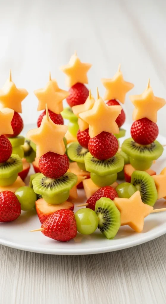 Thread fruits on skewers for holiday wands. Use a star-shaped melon or pineapple piece on top. Healthy, colorful, and fun to hold.