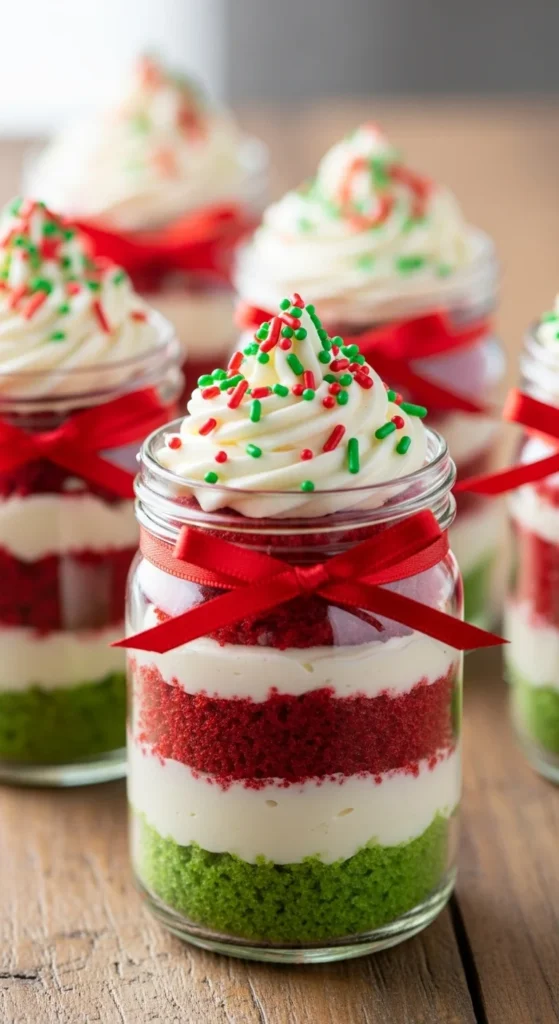 Layer red and green cake pieces with frosting in small jars. Add ribbons and jingle bells for a fun, portable dessert jar.