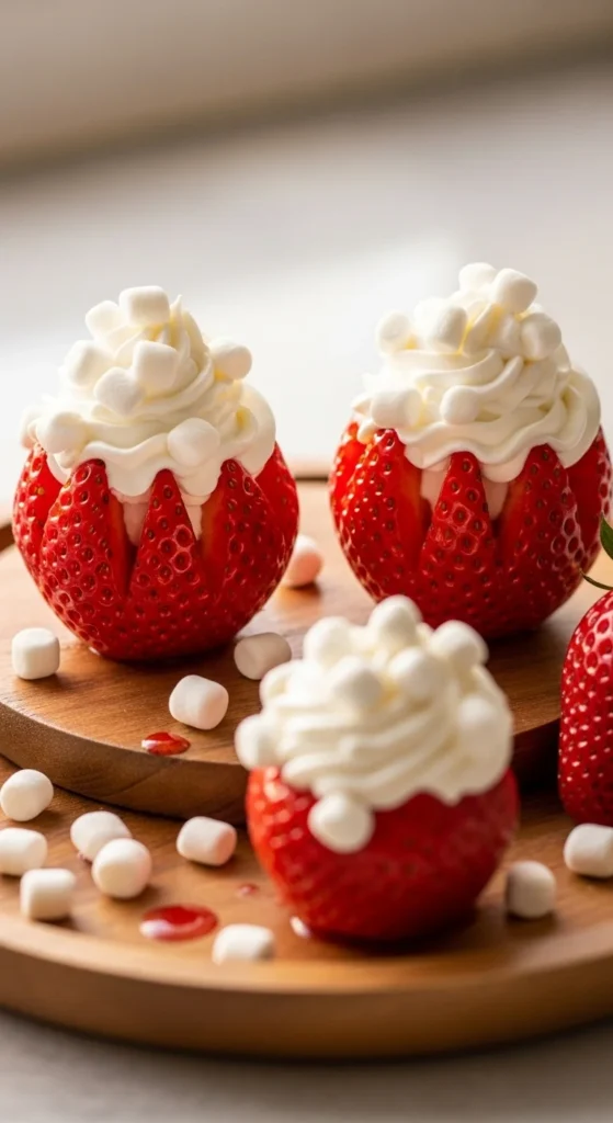 Make Santa hats by adding whipped cream and a marshmallow tip to strawberries. Fresh, light, and adorable — kids can pop them like candy.