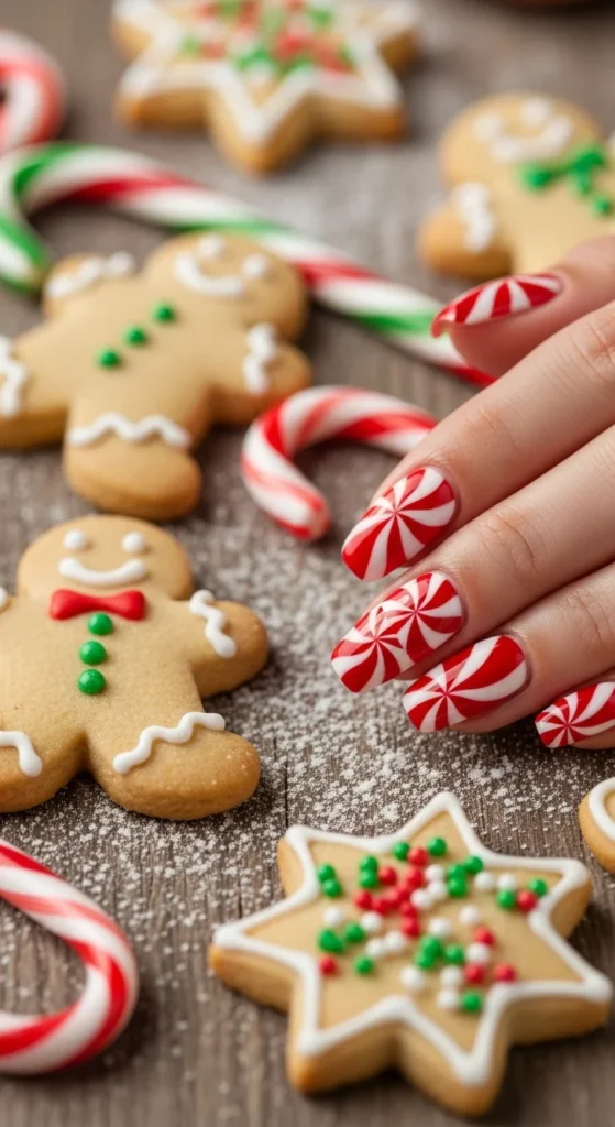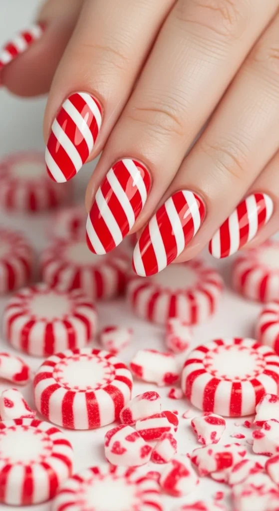 Give your nails a fun Christmas twist with candy cane stripes. Use tape or a thin nail brush to draw white lines on a red base. Add a top coat for shine. It’s playful, DIY-friendly, and looks adorable in photos.