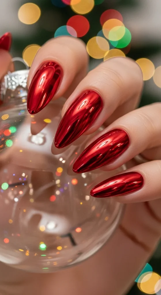 Chrome nails catch every light in the room. Use a red chrome powder over gel polish for a mirror-like shine. The metallic reflection makes it perfect for Christmas parties and photos.