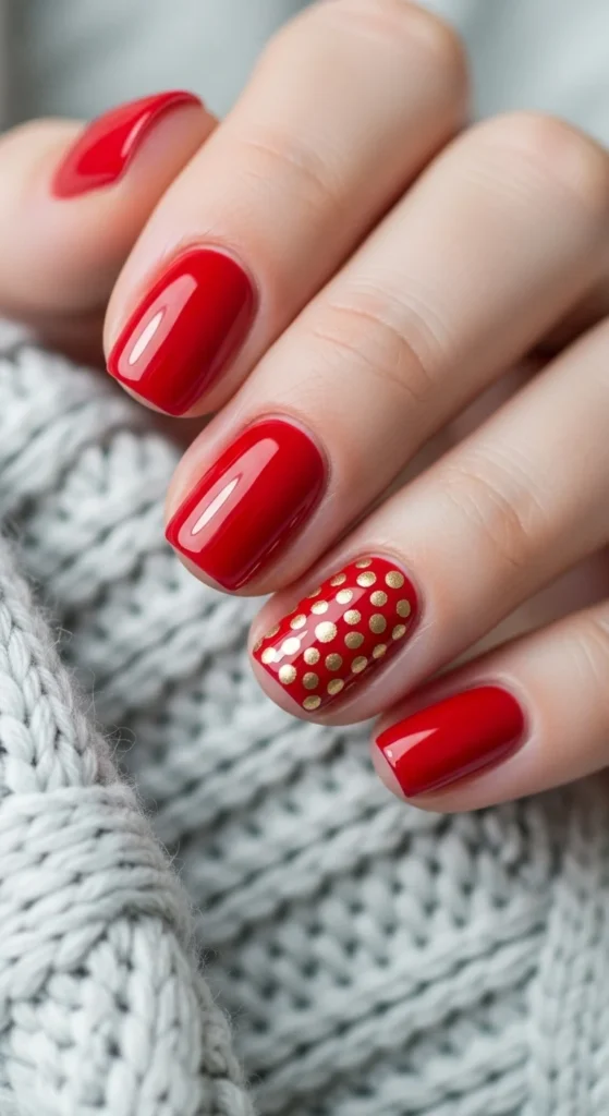 Keep it subtle with one decorated nail. Paint all nails red except one, which can feature a small design—gold dots, a star, or a simple stripe. It’s elegant and quick for DIY lovers.
