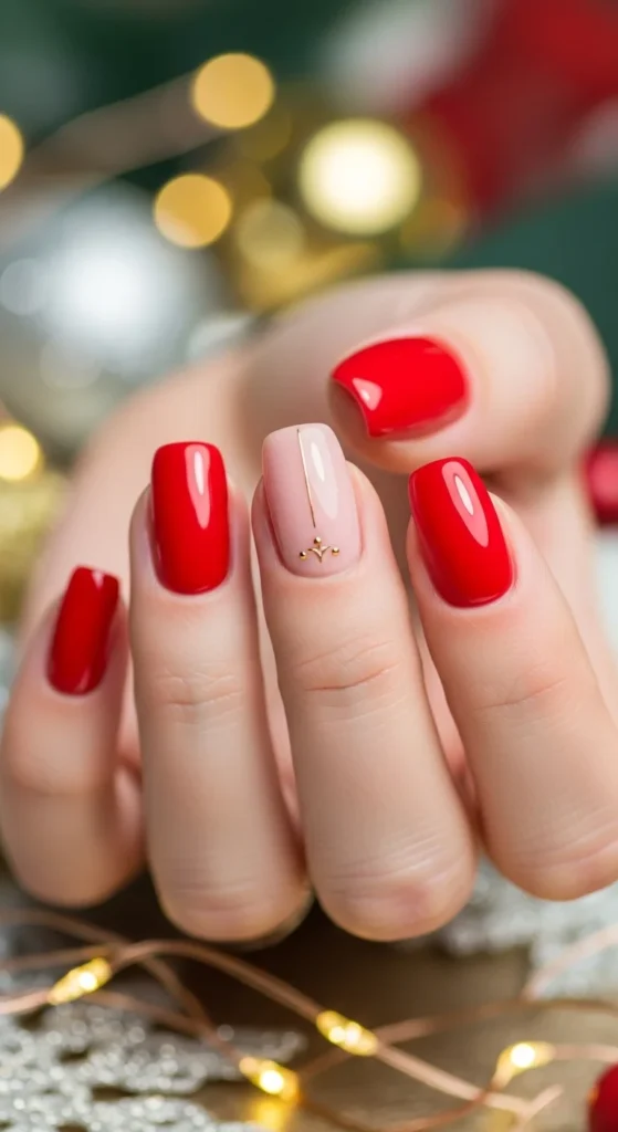 Mix red with nude polish for a balanced, sophisticated style. Alternate colors or add thin red lines across nude nails. It’s an understated look that still feels festive and polished.