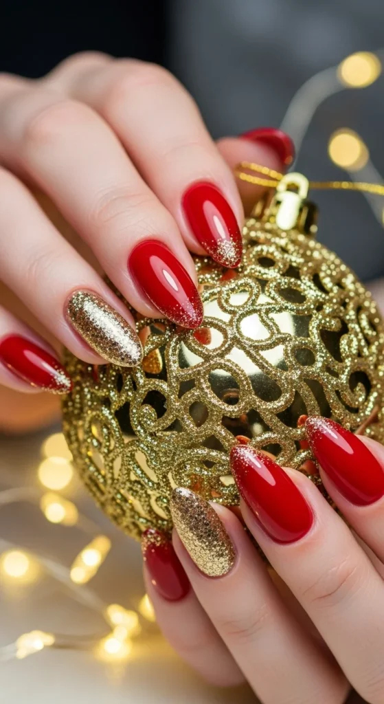 Add sparkle with gold glitter tips. Start with a red base and dab gold glitter polish on the tips using a sponge. The fade effect looks classy and festive. You can also use gold foil or tiny sequins for a more textured look. Perfect for New Year’s parties or Christmas Eve dinners.