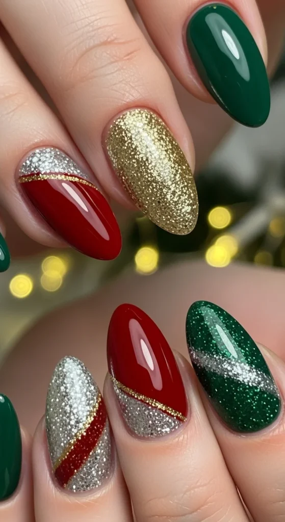 Bring in the holiday palette with red and green nails. Alternate colors or combine them with diagonal patterns. Add a glitter coat for sparkle. This combo instantly gives festive energy without extra effort.