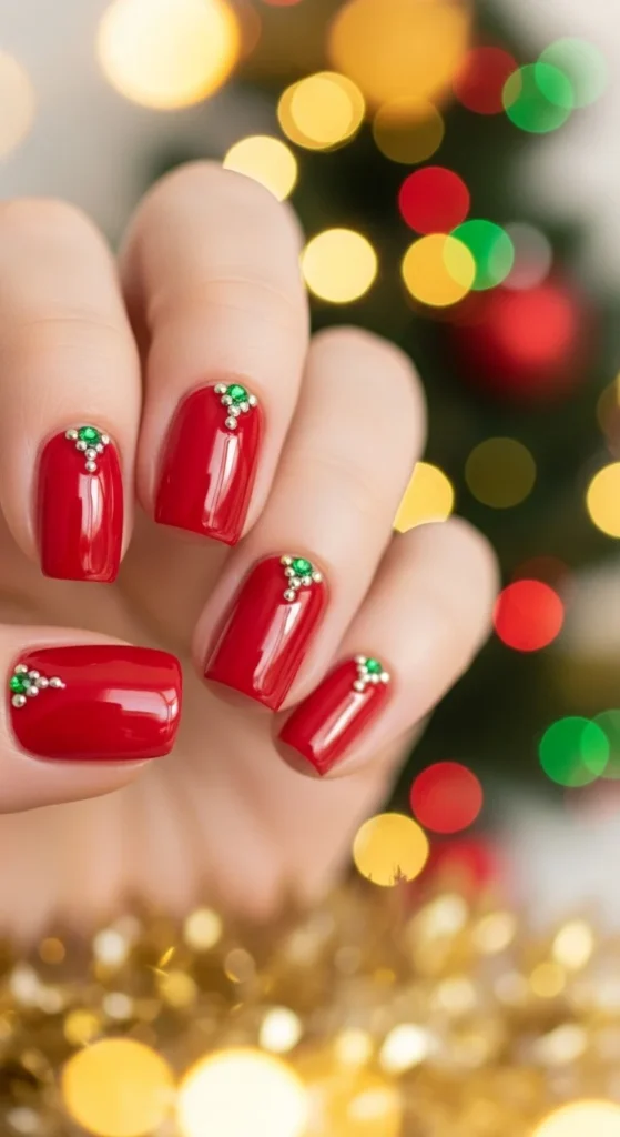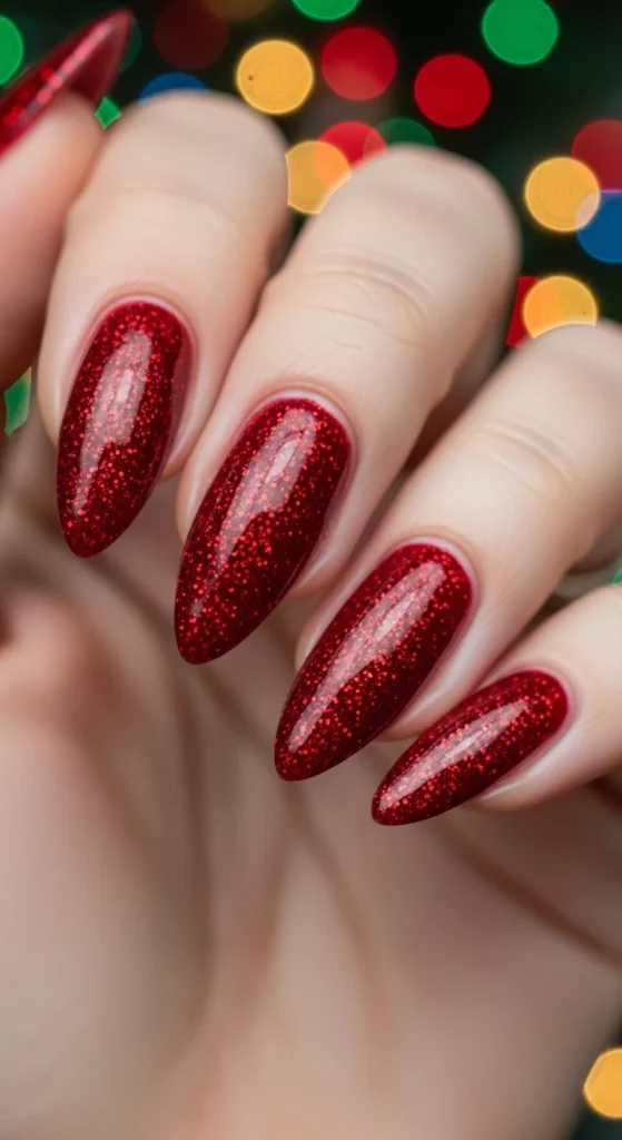 Go all-out with full glitter coverage. Apply a dense glitter polish or layer red glitter over a red base. Finish with two top coats for smoothness. It’s festive, bold, and absolutely Christmas-perfect.