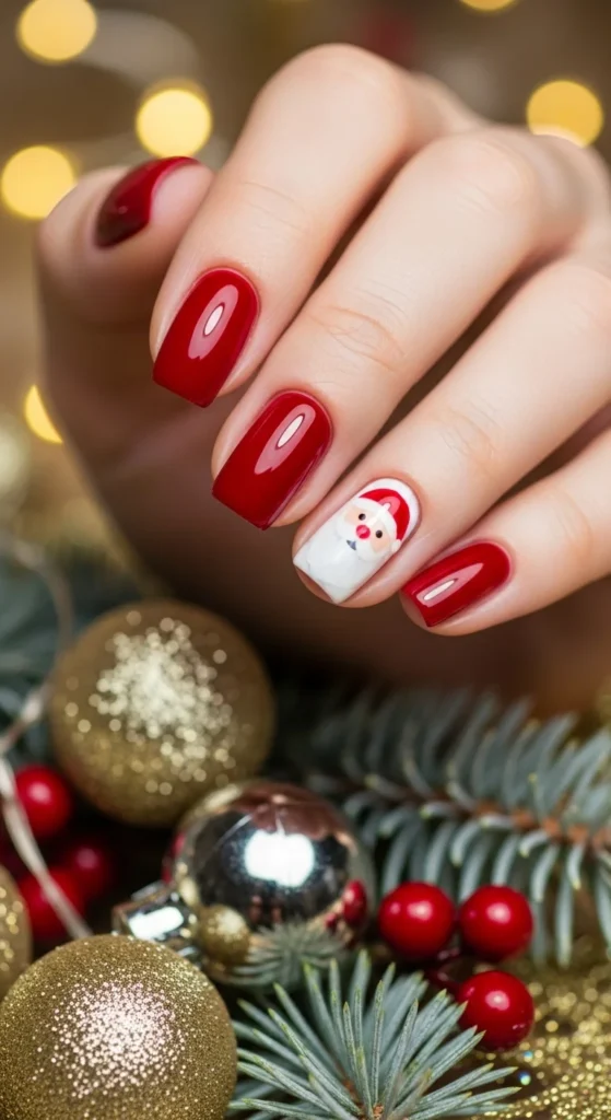 For playful energy, paint one accent nail with a Santa face or hat. Use a fine brush or stickers for detail. It’s cheerful and adds a fun twist to your regular red manicure.