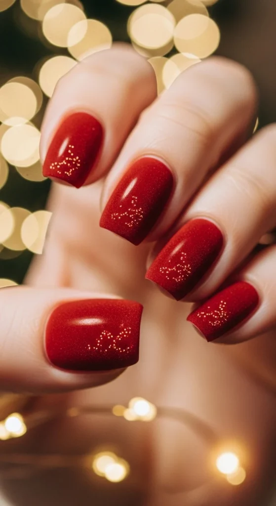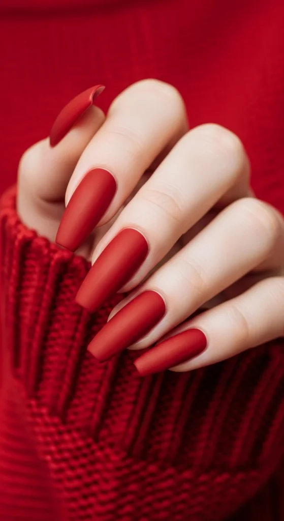 Matte red nails have a sophisticated edge. Apply a matte top coat over your favorite red polish for that velvety finish. It’s sleek and modern while still feeling festive. Pair it with gold rings or cozy outfits for an understated holiday look.