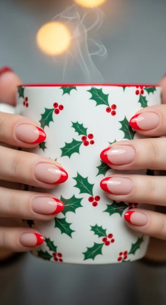 Switch up the classic French manicure by replacing white with red. This look feels clean yet festive. Use a fine brush for even tips. You can also add tiny snowflakes or dots for a more Christmasy vibe. It’s chic and simple to recreate at home.