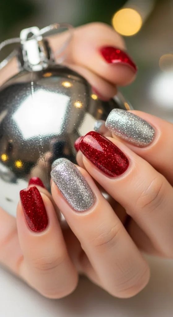 Combine red and silver polish for a glamorous mix. Alternate between solid red and silver glitter nails. This design catches light beautifully and looks amazing for parties. Apply a top coat to seal the shine and prevent chipping.