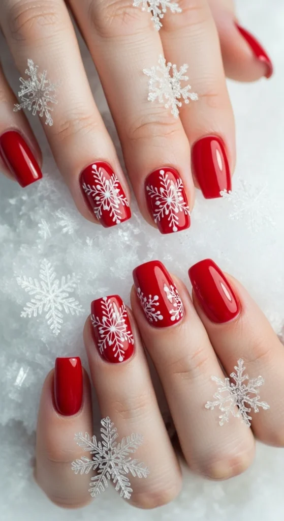 Add snowflakes for a wintery touch. Paint your nails red and use a fine brush or stamping tool for white snowflakes. You can even add rhinestones at the center. It’s a festive detail that brings your nails to life.
