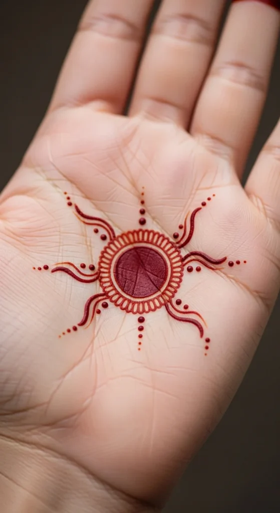 A palm center sun circle takes the round motif and gives it a radiant look. Start with a clean circle in the middle of the palm. Then add short lines, petal rays, or teardrop strokes moving outward around it. This creates a sun-like effect that looks cheerful and decorative while staying simple to execute.