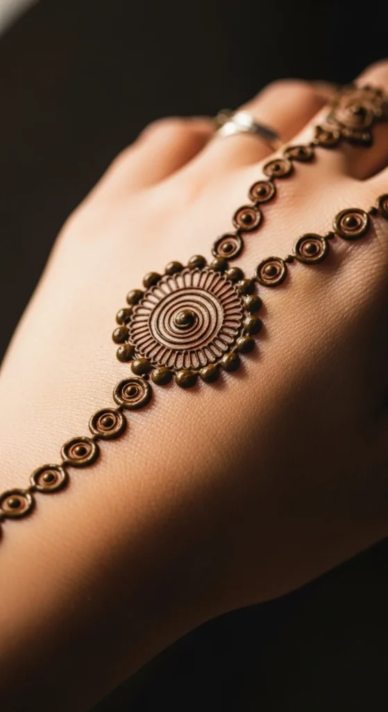 A circle and chain bracelet combines the beauty of a focal motif with the charm of jewelry-style mehndi. Start with one round medallion on the back hand or wrist, then extend tiny dotted chains from it toward the fingers or around the wrist. These chain lines can be made from dots, tiny loops, or very short curved links.