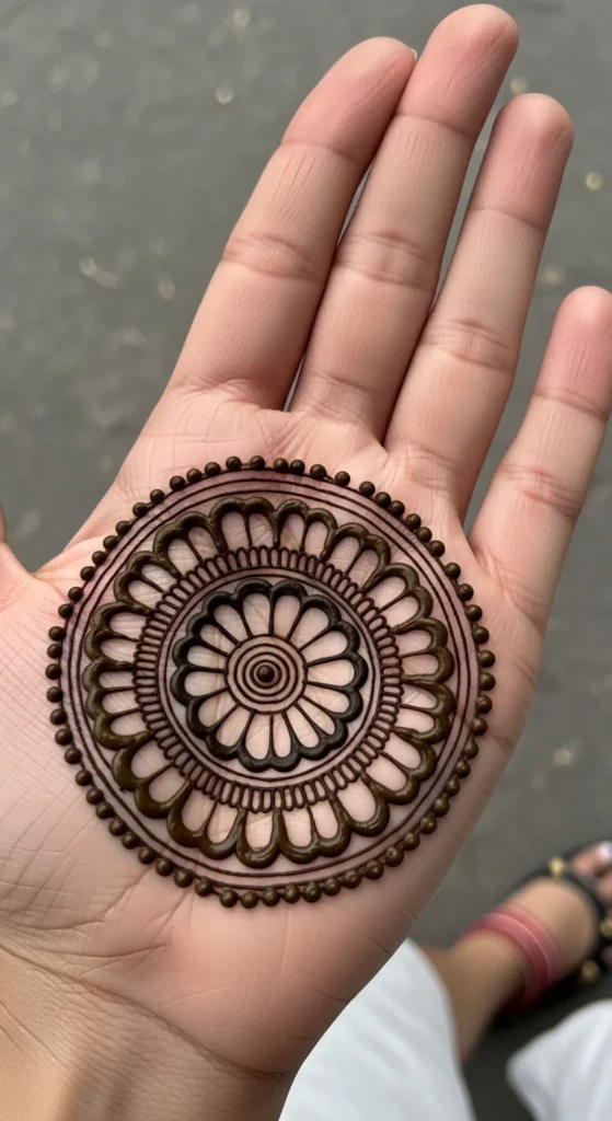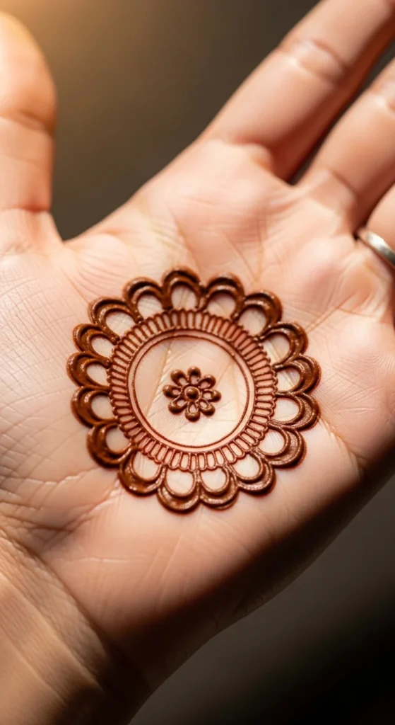 A floral core circle combines two very popular mehndi elements in one simple layout. Start with a circle in the center of the hand, then place a tiny flower inside it. The flower can be as basic as a dot with five petals around it. That is enough to make the circle feel decorative and feminine without becoming difficult.
