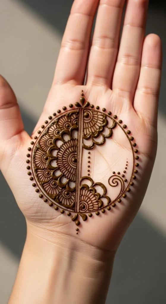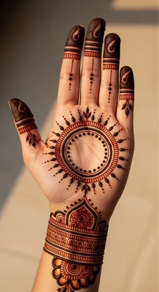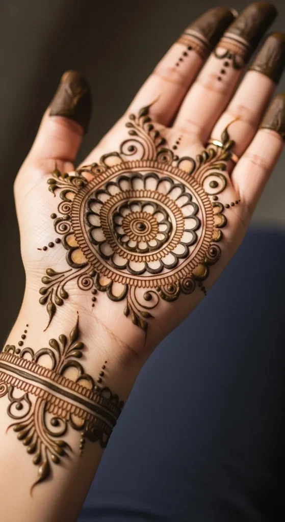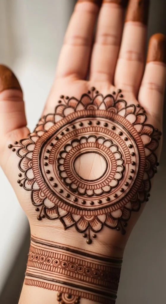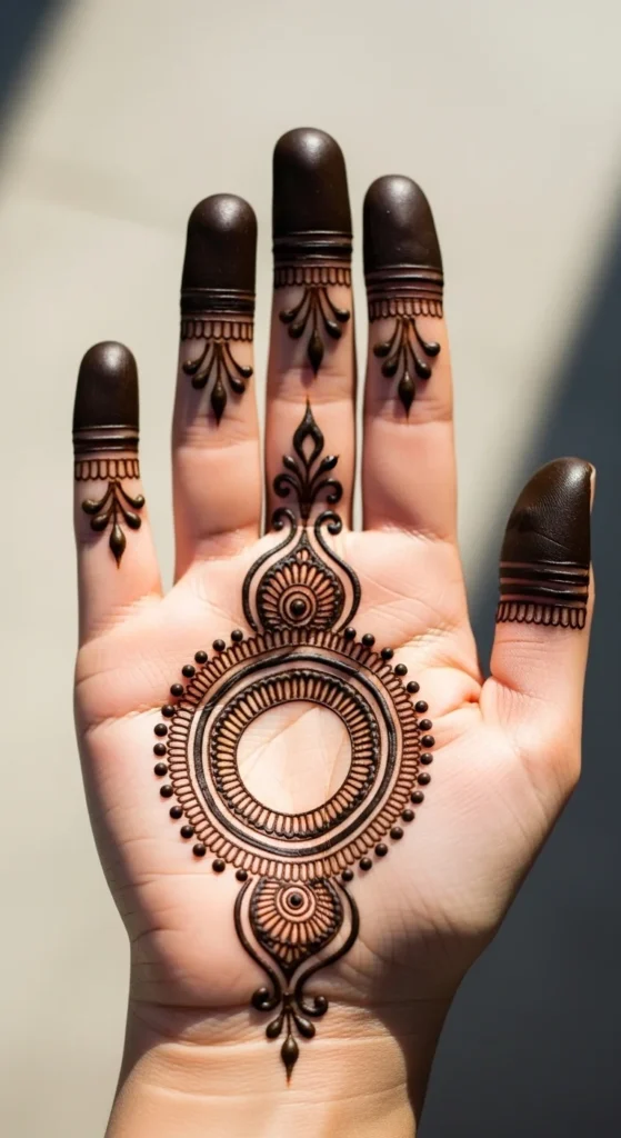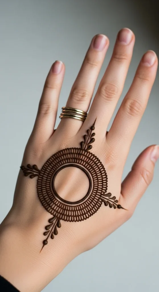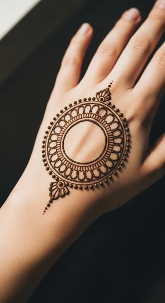 A classic center circle is one of the easiest mehndi ideas to start with because the shape does most of the visual work for you. Begin by drawing one round shape right in the middle of the palm or back hand. Once that is placed well, the rest of the design becomes much easier to build. You can leave the circle plain, fill it with dots, or add one ring around it for more definition. This style is perfect for beginners because it gives the hand structure without asking for a lot of detail.
