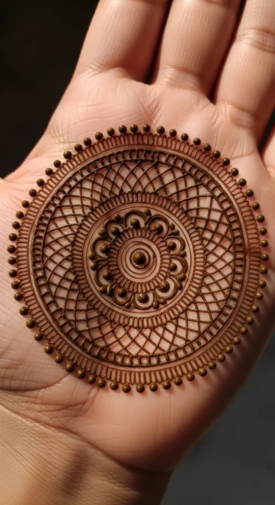 This design is a smart choice when you want detail but do not want to draw many flowers or leaves. The repeated net lines are easier to control once you get into the rhythm. If the net feels too sharp on its own, the dots soften it and make the circle feel more mehndi-like rather than purely geometric.