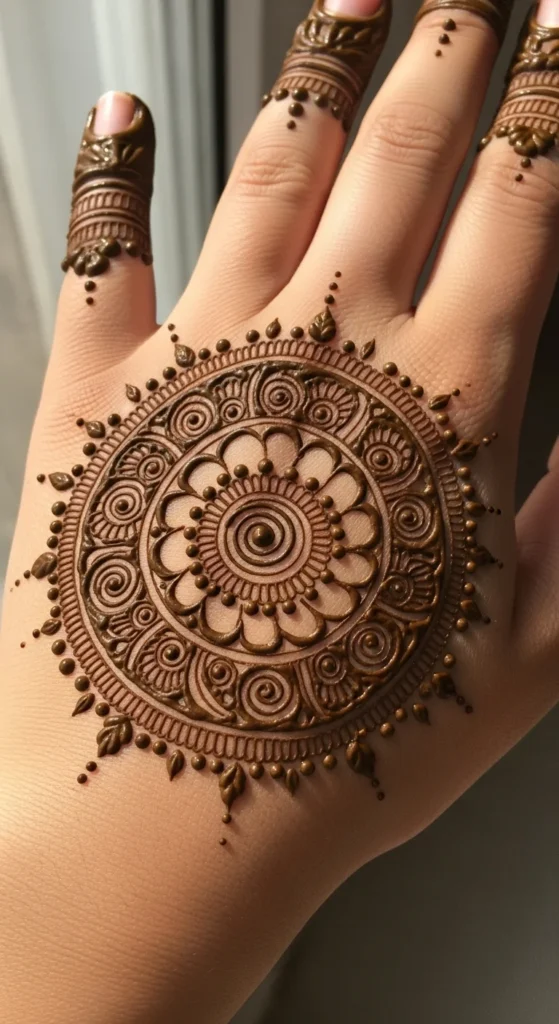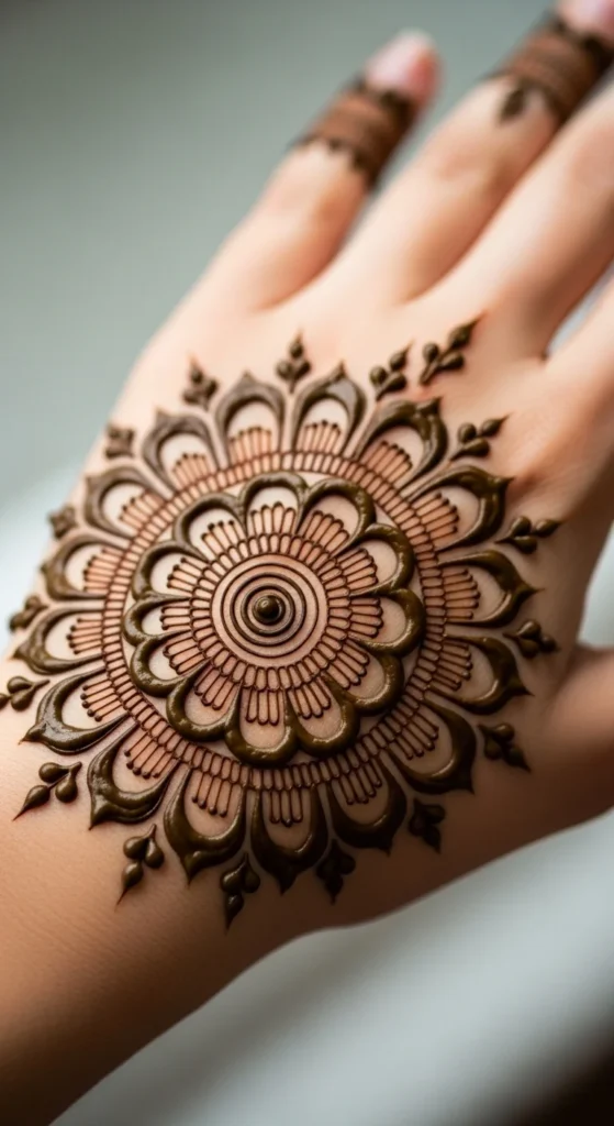 A full focal mandala circle is the most complete version of a circle mehndi design. It starts with a center dot or flower, then grows outward in neat rings of petals, dots, curves, and borders. The reason it works so well is that everything expands from one central point. That keeps the design balanced even when it becomes more detailed.