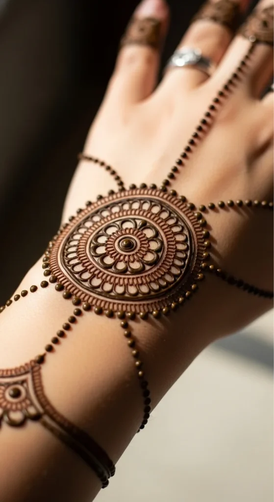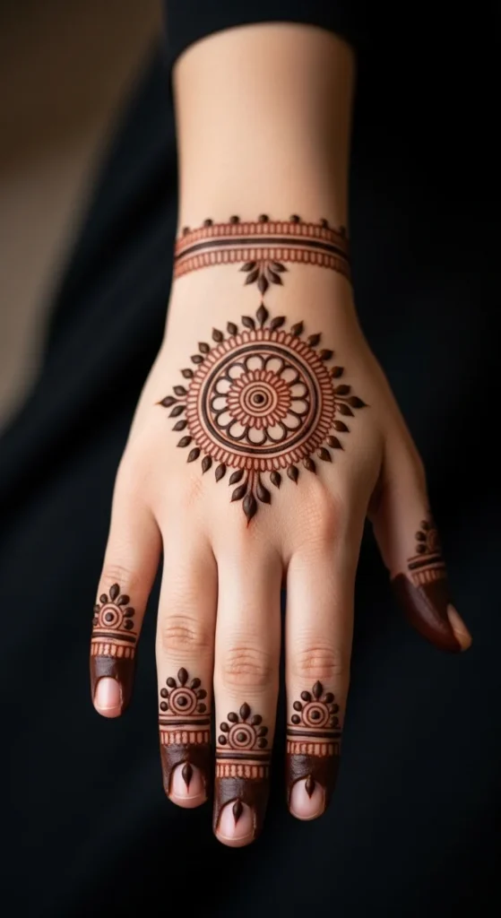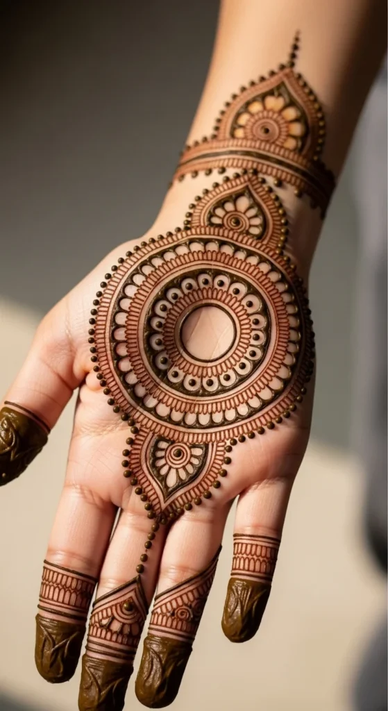 This design is lovely for festive events, engagement gatherings, or anyone who likes accessory-style mehndi. It is stylish, graceful, and keeps the focal circle clearly in charge of the composition.