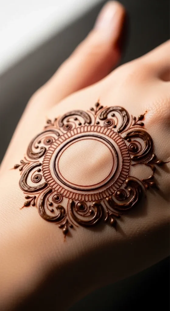 An empty center ring looks striking because it uses space so well. Instead of filling the middle, draw one bold circular border and leave the center blank. This creates a modern mehndi look that feels clean and stylish. It is especially nice for the back hand, where minimal designs often stand out more clearly.