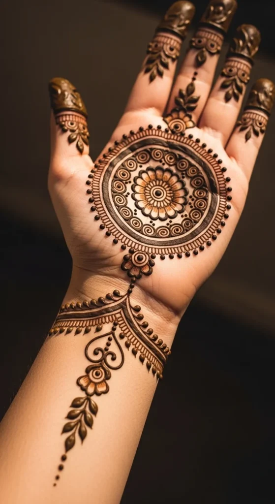 This style is helpful if you like geometric mehndi or want something a little more playful than a basic mandala. The circle chain creates movement across the hand while still keeping the biggest motif as the center of attention. You can use tiny dots or curved lines between each circle to make the spacing feel smoother.