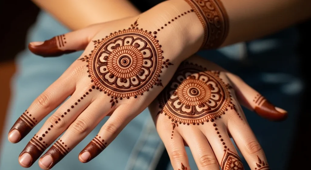 A classic center circle is one of the easiest mehndi ideas to start with because the shape does most of the visual work for you. Begin by drawing one round shape right in the middle of the palm or back hand. Once that is placed well, the rest of the design becomes much easier to build. You can leave the circle plain, fill it with dots, or add one ring around it for more definition. This style is perfect for beginners because it gives the hand structure without asking for a lot of detail.
