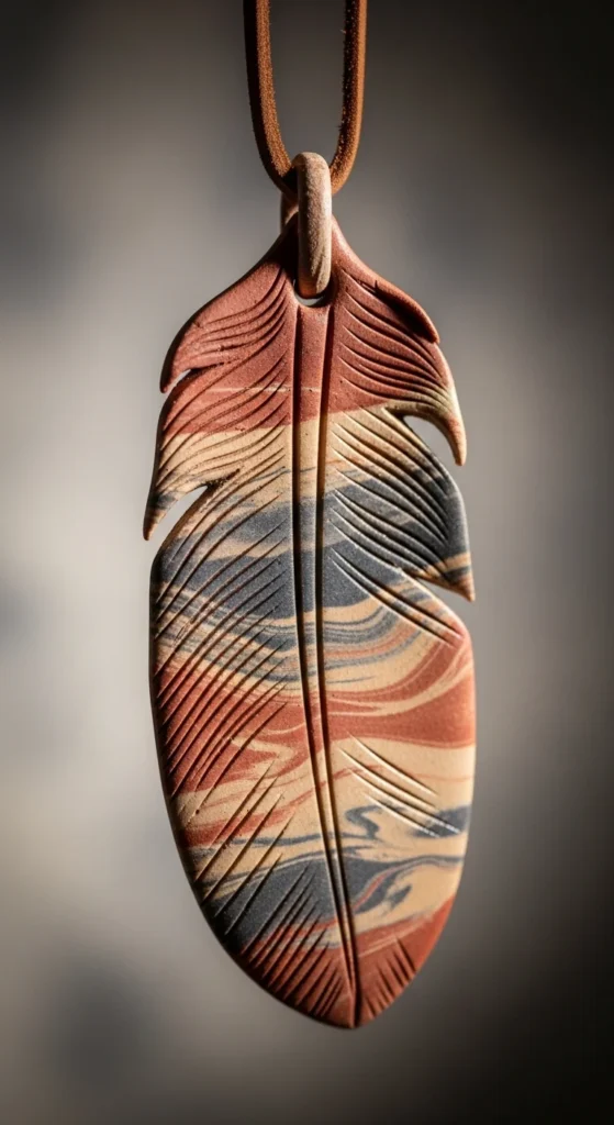 Feather pendants have a soft natural look. Roll clay flat and cut a long oval shape with a pointed tip. Use a toothpick to etch fine lines down the center and sides. Make a hole at the top for stringing later. Paint in earthy tones or light metallic shades.