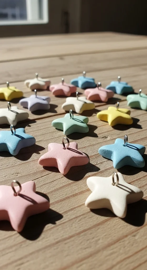 A small clay star makes a cute charm for backpacks or purses. Roll the clay flat and cut out a star using a cutter or knife. Keep it thick enough so it won’t bend after drying. Use a toothpick to make a small hole at the top for hardware. After it dries, paint it in bright or pastel colors and seal it.