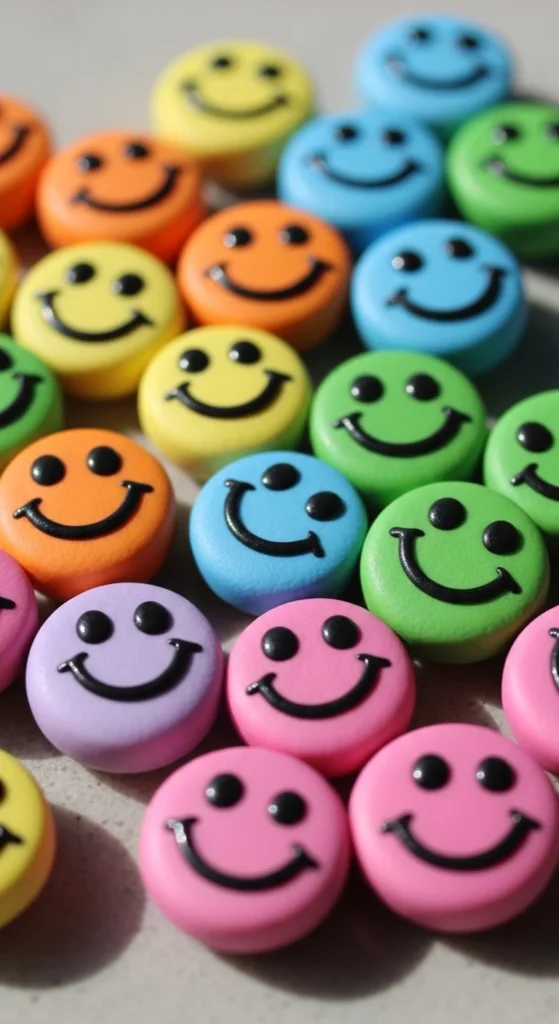 Smiley charms add a playful touch to keychains or bags. Cut small circles from rolled clay using a cap or cutter. Press simple eyes and a curved smile into the surface. Keep the shapes slightly thick for strength. Paint in bright cheerful colors once dry.