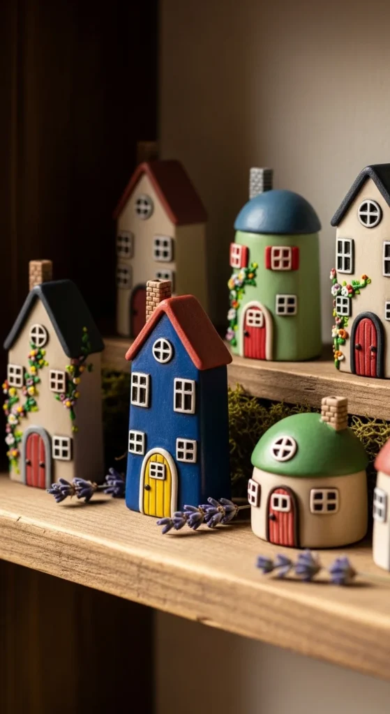 Tiny houses make charming shelf decorations. Shape a small cube and pinch a triangle roof on top. Use a tool to carve little windows and a door. Keep details shallow so they don’t crack while drying. Paint in soft cottage-style colors afterward.