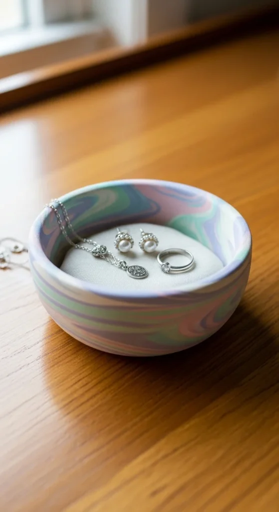 This little bowl is both pretty and useful for tiny items. Lightly mix two clay colors without fully blending them. Roll into a ball and press into a small bowl lined with plastic wrap. This gives it a smooth curved shape while keeping the marbled effect. Let it dry fully, then seal with varnish.