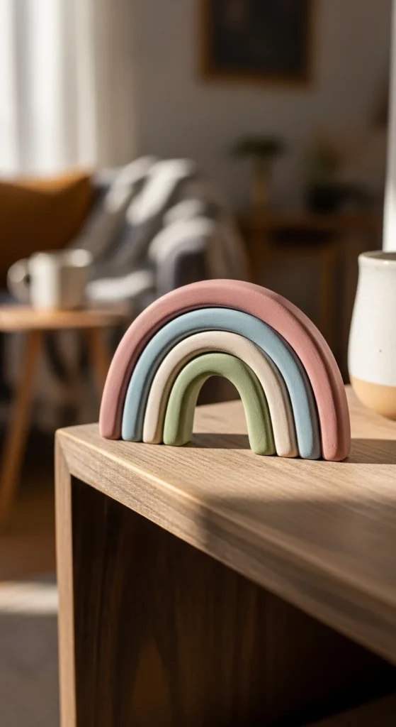 Mini rainbows add a soft decorative touch to shelves or desks. Roll thin clay ropes and curve them into arches. Stack the arches gently on top of each other and smooth the joins. Keep the colors muted for a calm look. Once dry, they stand up nicely as small decor pieces.