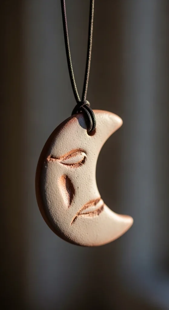 A moon pendant is simple and stylish. Roll clay flat and cut a crescent shape with a knife. Smooth the edges with your fingers. Poke a hole at the top before drying for a string or chain. Paint in soft white, gold, or silver when dry.