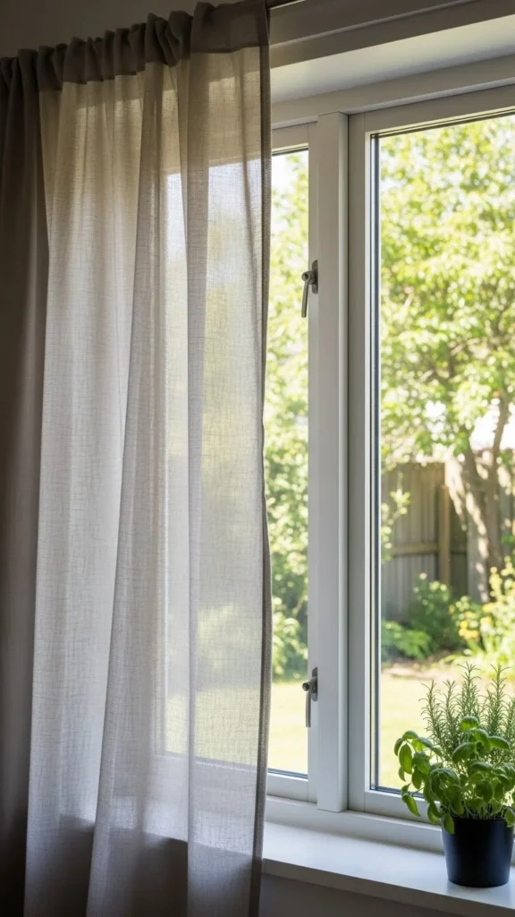 Sheer linen filters light gently and softens window edges. Keep panels simple and light in color. Hang them high to make windows feel taller. Linen blends well with beige, cream, and soft gray kitchens and adds movement without heaviness.