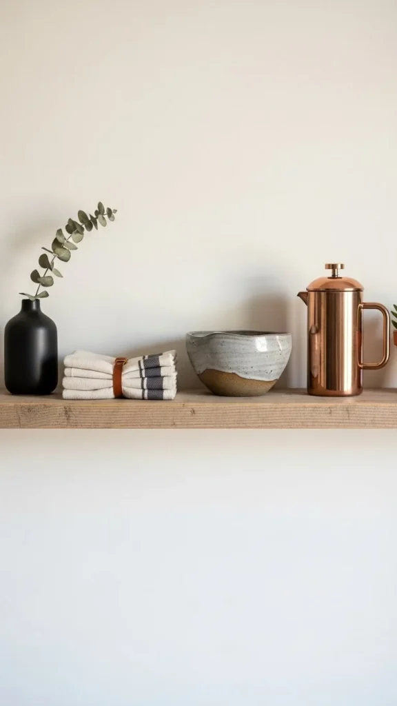 Ceramic bowls in soft shades add calm visual weight. Stack them on open shelves or counters. Mix shapes but keep tones similar. Thrift stores are great for finding neutral ceramics that already have a worn-in feel.