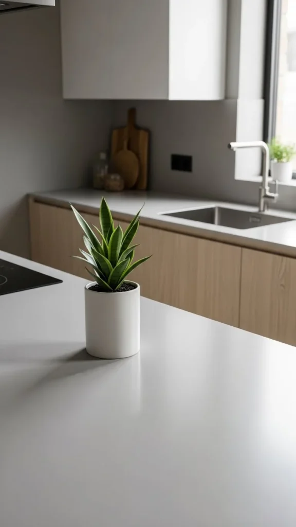 One plant adds life without noise. Choose low-care greenery like pothos or olive branches. Use a neutral pot. Place it where the kitchen feels empty.