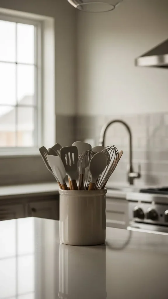Wood-handled tools soften metal-heavy kitchens. Store them in a crock near the stove. Thrifted utensils work well and add warmth naturally.